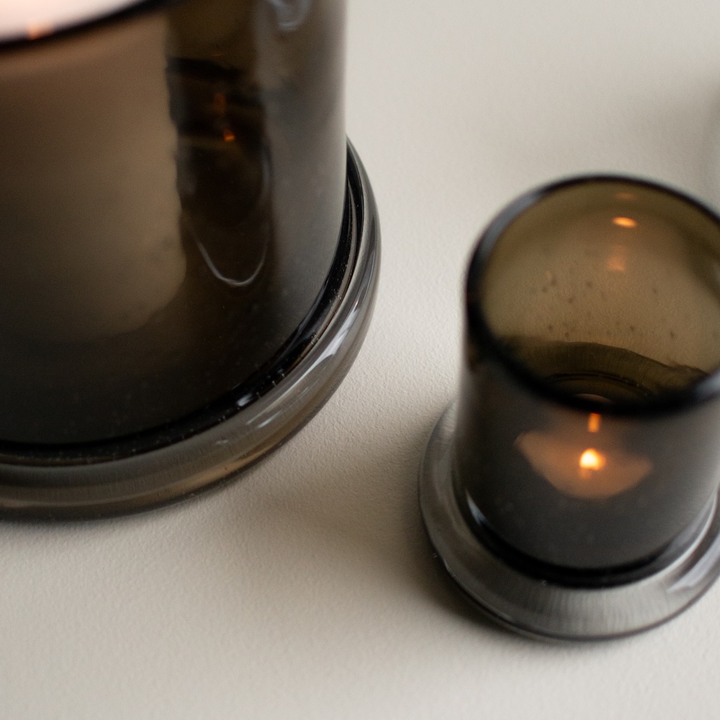 Windlicht für Stabkerzen mit dunkelgrauem Teller