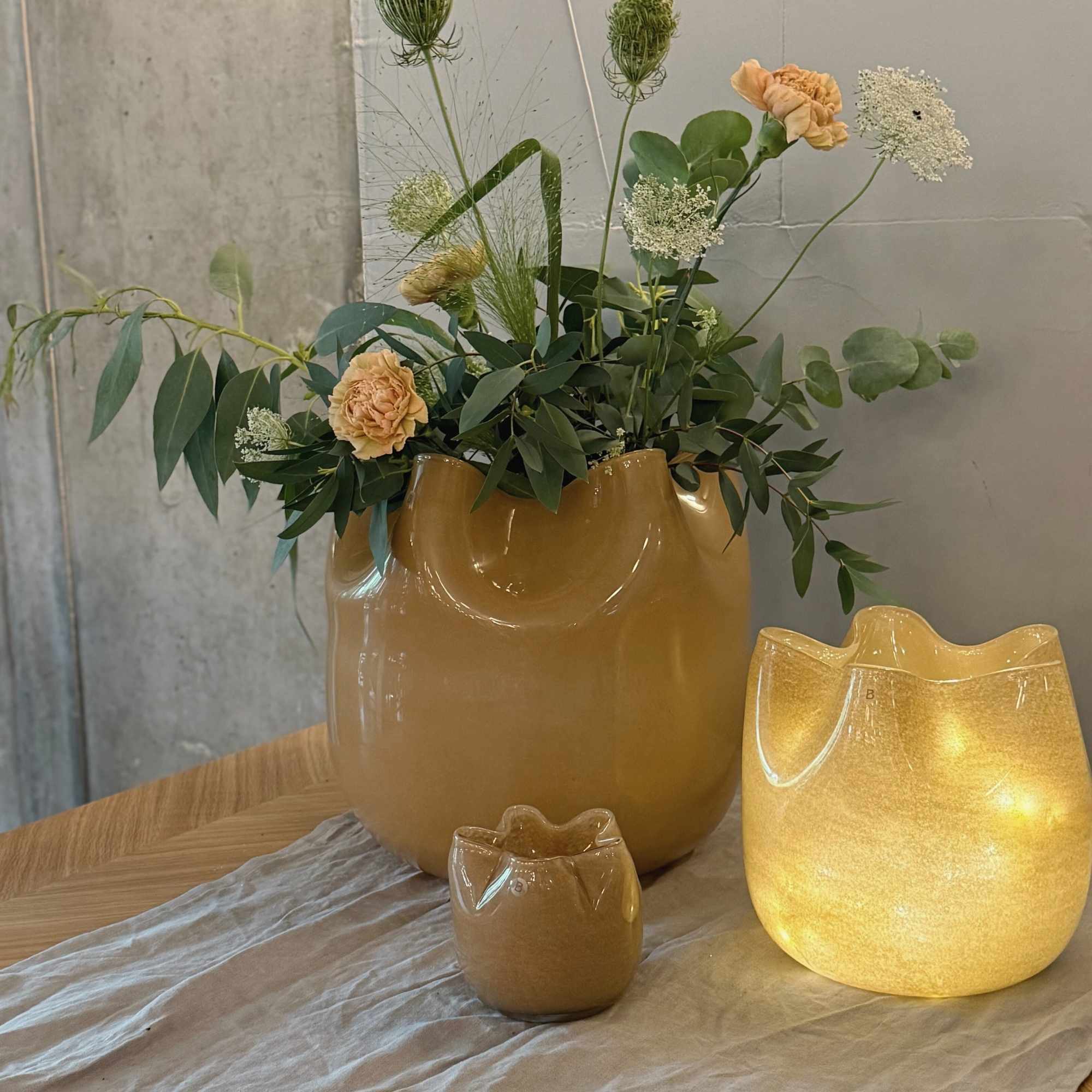 Auf dem Esstisch wirkt Deko mit Kerzengläsern besonders harmonisch, wenn du sie mit zwei bis drei weiteren Dekoelementen kombinierst. Wenn dein Tisch groß ist, darf die Deko bitte nicht klein sein. Achte hier also auf Proportionen. Unterschiedliche Höhen sorgen dabei für ein stimmiges Arrangement, das sofort Atmosphäre schafft.
