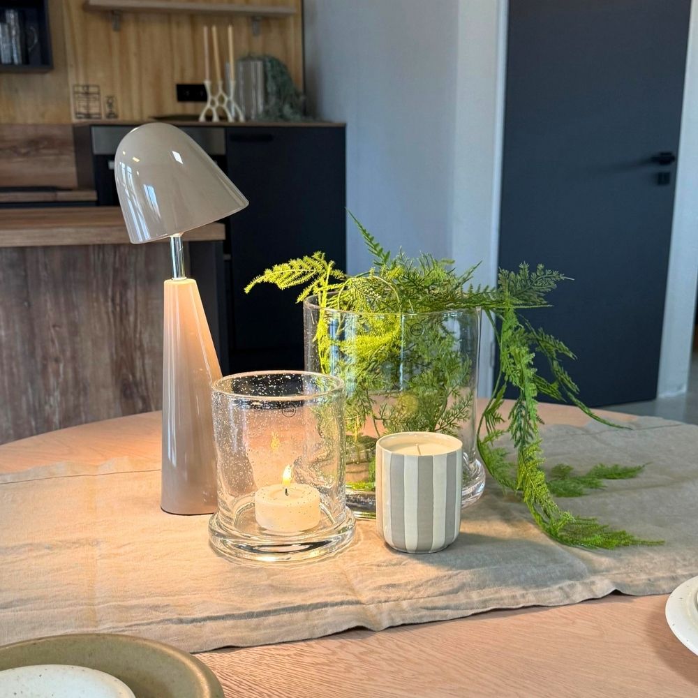 Dabei musst du nicht alles in einer Vase mischen. Oft wirkt es sogar noch natürlicher, wenn die Kombination im Arrangement entsteht: Zum Beispiel ein künstlicher Grünzweig im Übertopf, daneben eine Vase mit frischen Blumen und ergänzt durch ein Windlicht. Genau dieses Zusammenspiel macht die Deko lebendig und besonders stimmig.